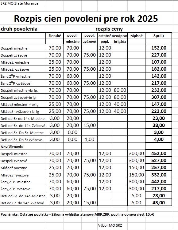 Ceny členského ,povolení a zápisného pre rok 2025 v znení smernice R-SRZ a uznesenia výboru