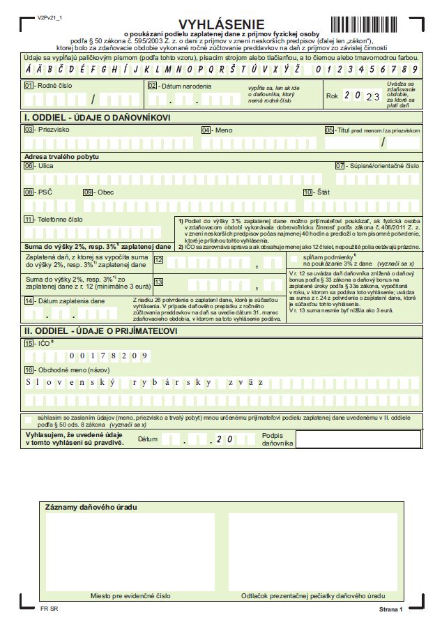 Vzory na vyplnenia Vyhlásenia o poukázaní podielu zaplatenej dane si pýtajte v kancelárii pri realizovaní platby za rybárske doklady. Môžete si ich stiahnuť aj z internetovej stránky MO SRZ ,alebo zo stánky Fin.správy SR. Môžu ich použiť aj Vaše manželky ,rodina, Vaši zamestnávatelia a ostatní občania , ktorí majú sympatie voči našej organizácii.